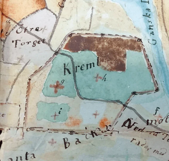 В дневнике за 1812 год между записями 92 и 93 помещена рукописная карта Нижнего Новгорода, сделанная Эрстремом. Карта цветная, нарисована акварельными красками на рыхлой бумаге, склеенной из нескольких частей. Надписи сделаны чернилами. На карте отмечены многие городские объекты, о которых идет речь в дневниковых записях. Они же перечислены в легенде в порядке букв латинского алфавита. Буквой і отмечена Staroverska Kyrkon (староверская церковь), находящаяся в непосредственной близости от кремля (рис. 1).